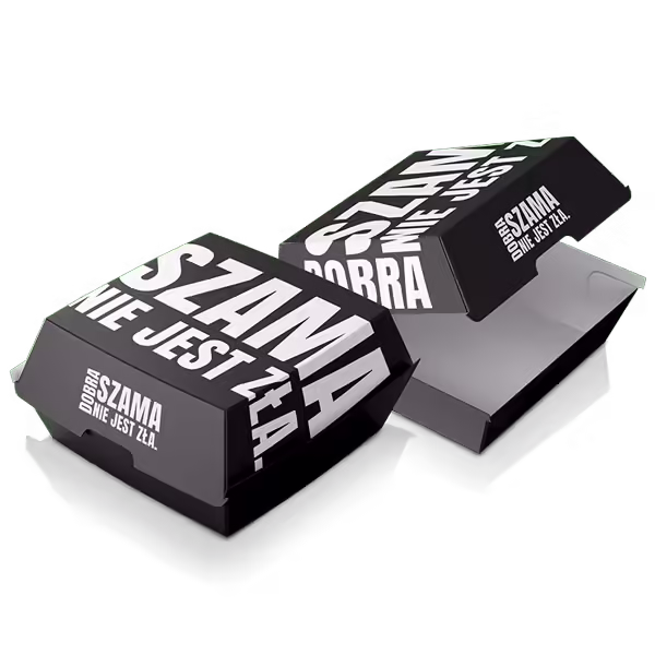 Opakowanie na burgera „Dobra Szama Nie Jest Zła” to coś więcej niż zwykłe pudełko – to styl, wygoda i profesjonalna prezentacja Twoich dań! Solidna konstrukcja, klapowe zamknięcie i certyfikat do kontaktu z żywnością zapewniają świeżość i bezpieczeństwo, a chwytliwy nadruk buduje rozpoznawalność Twojej marki.