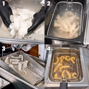 - Mięso natychmiast po panierowaniu wkładamy do frytkownicy (temp. frytury ok. 175-180OC) i po zanurzeniu jeden raz potrząsamy sitem, w celu uniknięcia sklejenia się poszczególnych kawałków. Smażenie: Ryba 3 minuty.