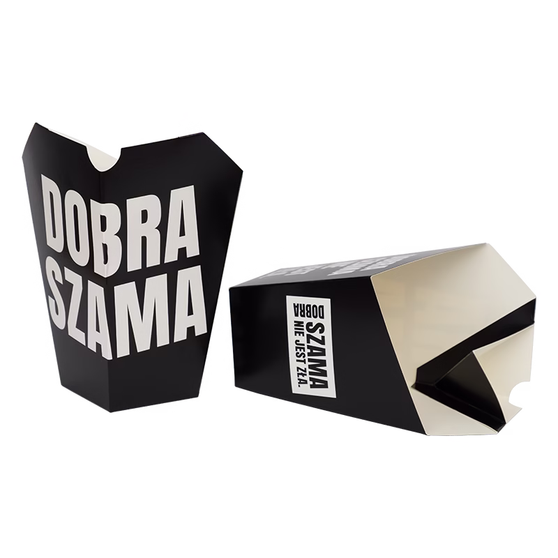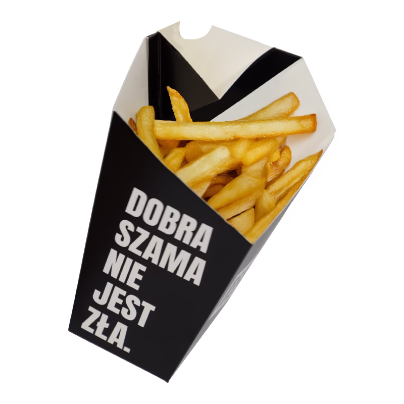 Innowacyjny rożek z płaskim dnem i przegródką na sos z linii „Dobra Szama Nie Jest Zła”. Czarne, stabilne opakowanie 2w1 pozwala serwować frytki, stripsy i przekąski wraz z sosem w jednym eleganckim pojemniku. Zwiększ średni rachunek, zredukuj liczbę opakowań i wyróżnij swój lokal designerskim rozwiązaniem, które klienci pokochają za wygodę i styl. Idealne dla fast foodów, food trucków i lokali z ofertą na wynos.