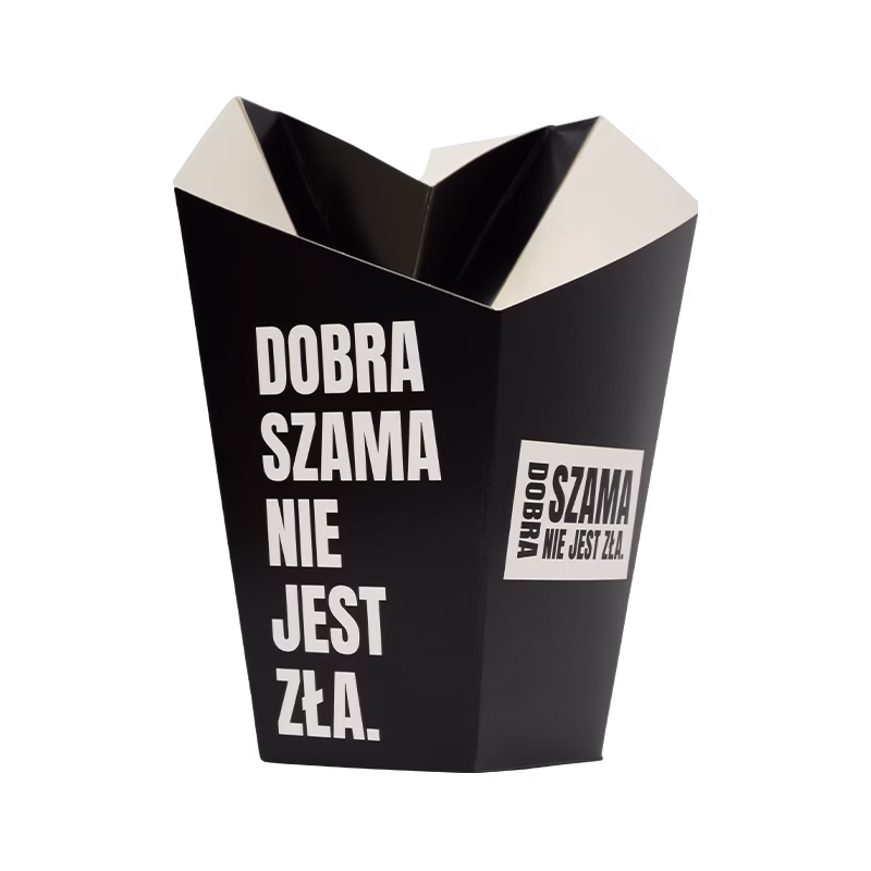 Twoi klienci nie tylko jedzą – oni przeżywają każdą chwilę z Twoim jedzeniem! Rożek „Dobra Szama Nie Jest Zła” z płaskim dnem i przegródką na sos to przełomowe rozwiązanie, które łączy funkcjonalność z nowoczesnym designem. To więcej niż zwykłe opakowanie – to sposób na zwiększenie przychodów i wyróżnienie Twojego lokalu na tle konkurencji.